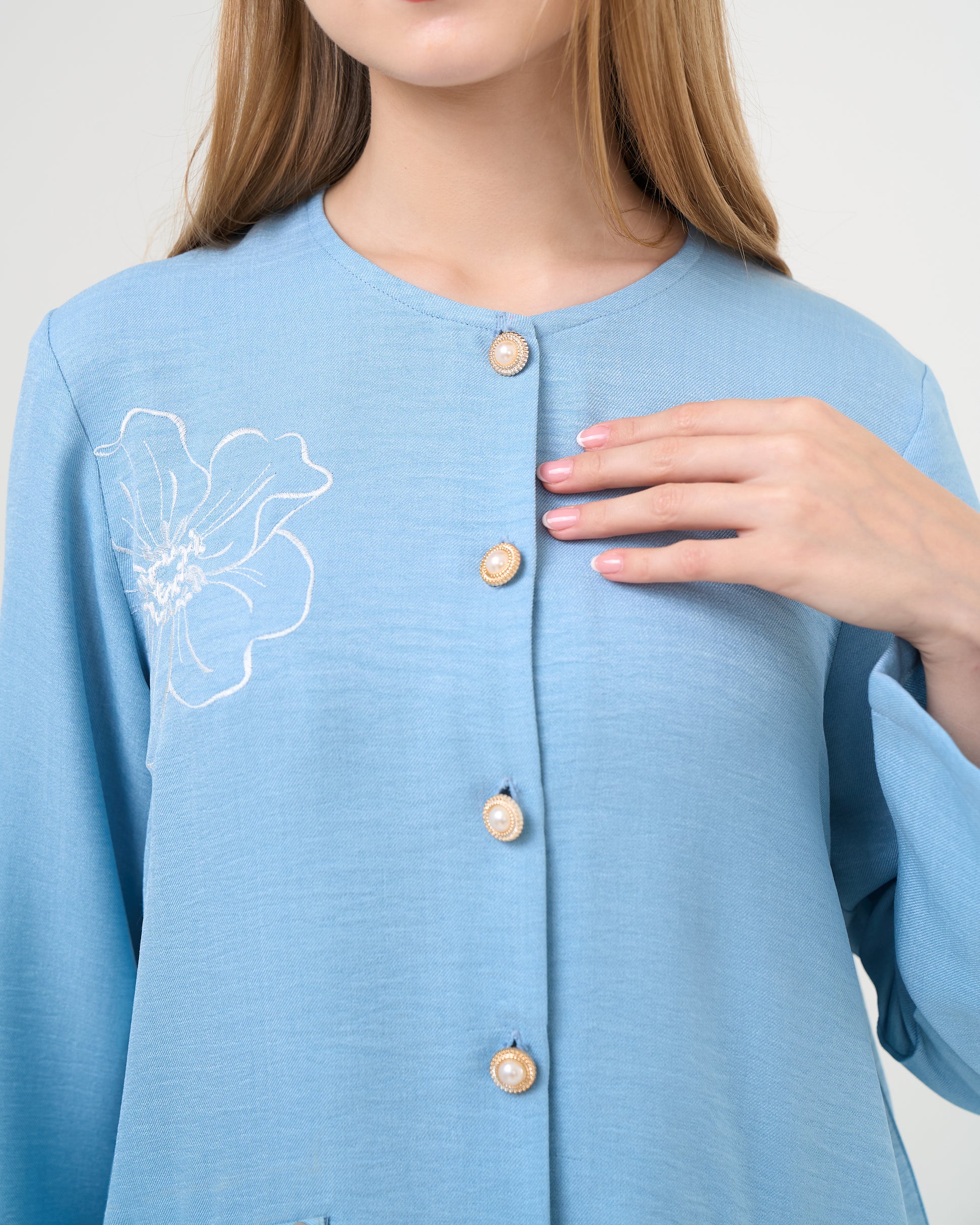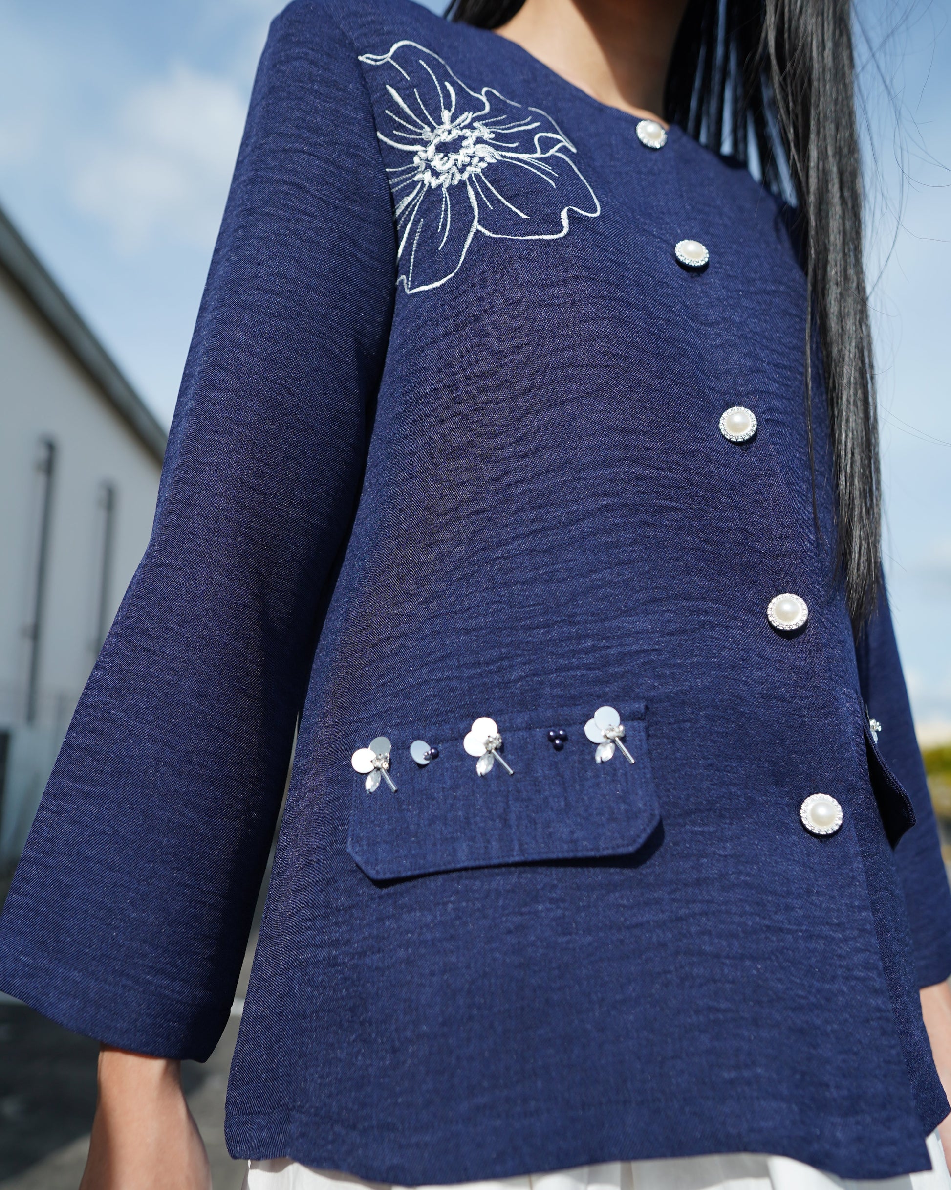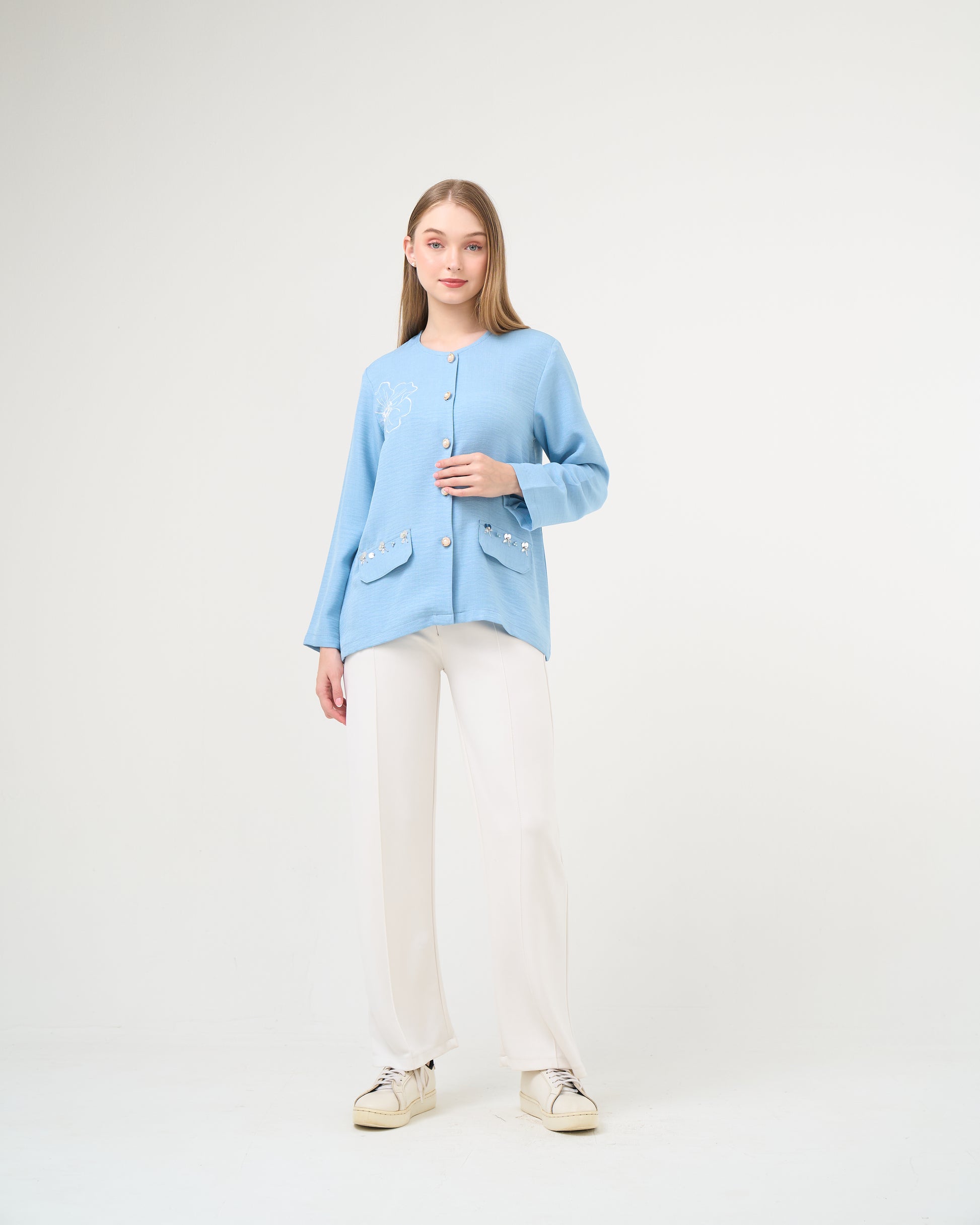 Blus dengan potongan simpel, dilengkapi bukaan kancing hias di bagian depan sebagai aksen pemanis. Detail bordir 2D & 3D di bagian dada dan beading di area depan menjadi daya tarik utama dari desain ini.